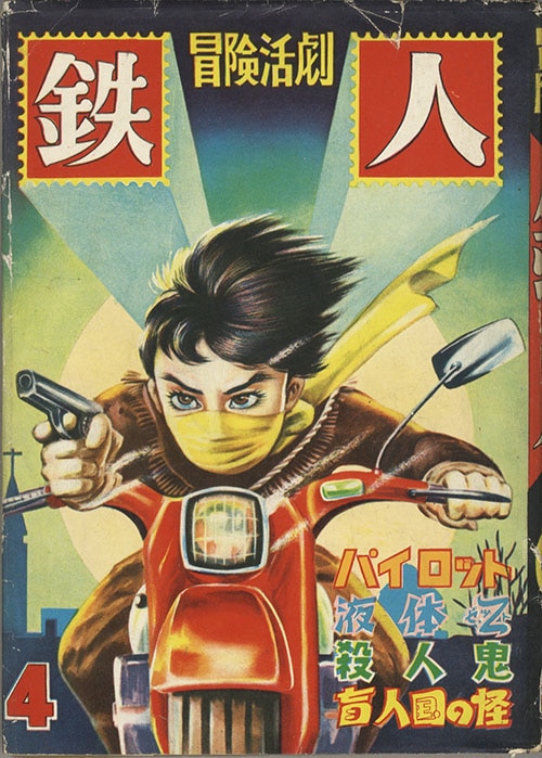 エンゼル文庫が発行したSF冒険活劇アンソロ「鉄人」。娯楽性を全面に推しだした誌面が印象的。表紙に某少年ジェット的な少年が走っていたり、見返しには何処かで既視感在りのお歴々が勢ぞろい(これは他の巻と共用)していたり。収録作品に登場するヒーロー達もなんとなく何処か他所に原型を感じたり。しますが、基本的に正義の味方が悪漢を懲らしめる、明朗に楽しみやすい内容。本誌全4号と別冊で2号、都合6冊が発行されたシリーズ。中でも最難関なのがこの4集(昭和34年発行)。巻末に東真一郎「プラスチックボーイ」を収録した、すなわち、水木しげる物件。この「プラスチックボーイ」、前年(昭和33年)に綱島出版から発表された「プラスチックマン」のリライト版。「マン」では青年風の男性であった登場超人を「ボーイ」ではその名の如く少年に改変。全90頁超の内容を30頁程に圧縮。同じエピソードが所々で描き直され、繰り返し使用される事が多く、その毎の風情・色の違いが魅力でもある水木作品ですがそのリライト路線の先駆けとなる1作。基本的な話の筋はリライト前と同じですが、そこに水木独特の取捨が加わり、なにか名状し難いテンポ(カットアップ的なというか何というか)を作品に与えています。加えて、注目すべきはその絵柄の進化。「マン」では水木らしさを存分に感じさせながらも、舶来の影響を色濃く残していたのに対し、「ボーイ」では完全に「水木調」といった絵柄を、間1年にして完成させています。手法、絵柄等々水木初期作品にして一つの完成形ともいえる所ではないでしょうか。コマ単位で見ても後に繰り返し使われる、どこかで見たことのある図版が散見されニヤリとさせられる所の多い作品です。「編集後記」部になんらかの紙片貼付を剥した跡(古書店の値札でしょうか?糸綴じ穴や書店印の押印等は無く貸本屋の貸出票跡では無さそうです)がありますが、それ以外は目だったイタミの無い状態良好個体です。